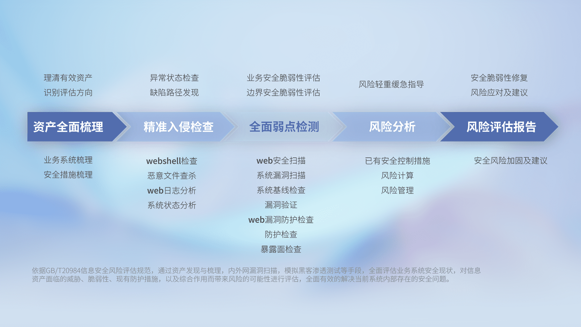 针对客户行业特性,,,,以专业的安全服务+多厂商联合解决方案提供专属的一站式安全管理服务,,,帮助客户全面感知网络空间威胁,,基于识别、、检测、、、、分析、、、防护、、、、监测、、、响应的服务理论模型,,,从方案咨询、、、集成交付、、评估验证、、、、优化加固、、、运维运营,,,致力于为客户提供完整的闭环管理式安全服务。。。以实战经验为客户打造高抵御风险的安全体系,,,帮助客户发现威胁、、对抗威胁、、、处置威胁,,,不断积累安全对抗能力,,,,持续保障数字化安全。。。